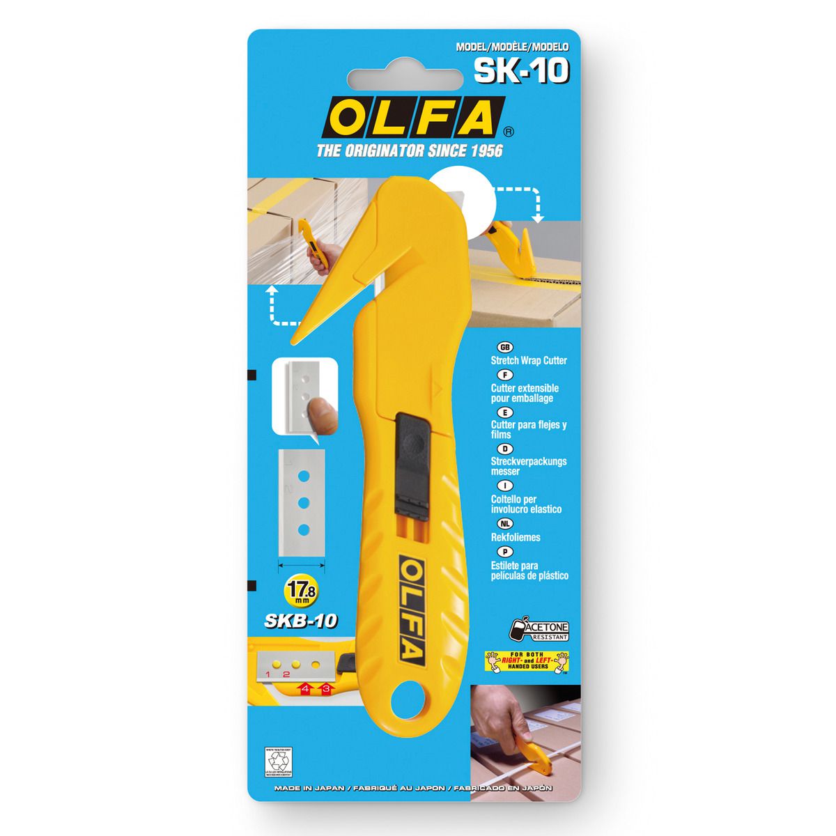 Cutter OLFA per imballaggi, per tagliare cellophane, regge e nastri in plastica; lama reversibile a filo unico con 4 punti di taglio; in blister; utilizza lame cod. SK10B Cutter antinfortunistico OLFA ® SK-10 è dotato di lama incassata nell'involucro di p