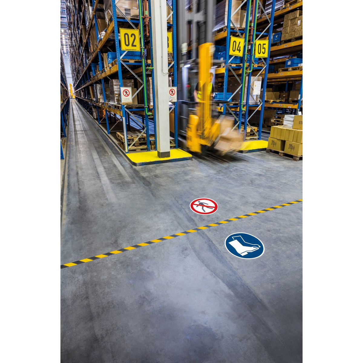 Segnaletica da terra per l'identificazione di aree pericolose, spazi di stoccaggio, passaggi pedonali ecc. Resistenza allo scivolamento R9 e conforme alla normativa DIN 51130. Conforme alla normativa UNI EN ISO 7010. Pittogrammi di sicurezza autoadesive