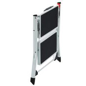 Sgabello pieghevole in acciaio per uso domestico e bricolage. Prodotto certificato secondo la normativa europea EN14183. Portata garantita 150 kg. Struttura in acciaio, con blocco antichiusura con tasto di sblocco. Comodo manico per il trasporto. Piedini antisdrucciolo. Due ampi gradini con tappetini antiscivolo. Facile da riporre: ingombro chiuso, misura solo 4 cm. Dati tecnici: Gradini: 2 Massima estensione: 44cm Misure scala aperta: 49x50x44cm Misure scala chiusa: 57x50x4cm Peso Netto: 4kg Portata max: 150Kg